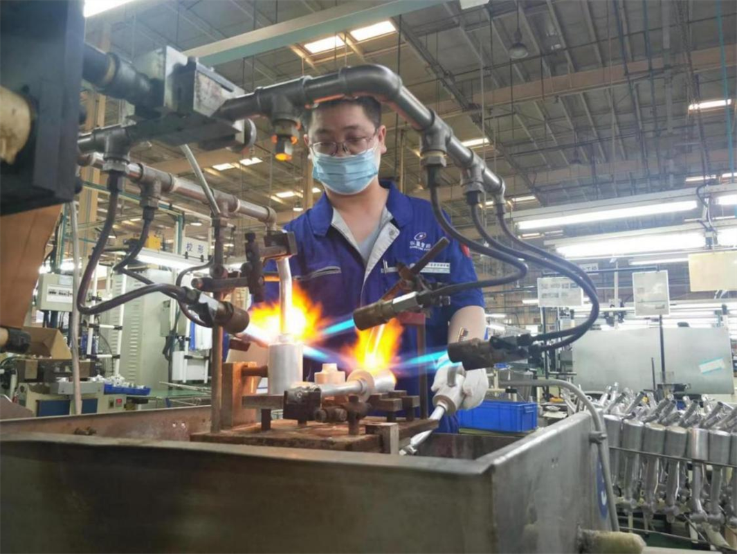 七月,酷暑時節(jié),酷熱難耐。此時,在煙臺東星空調(diào)管路有限公司(YDP)有這么一群人,正默默堅守奮戰(zhàn)在比天氣更為炎熱的工作崗位上,他們就是焊接班的75名員工。汽車空調(diào)管路焊接運(yùn)用的是火焰釬焊工藝,用2000多℃的高溫火焰進(jìn)行焊接。特點(diǎn)是產(chǎn)熱高、散熱多,尤其是自動焊機(jī),每個工位都裝有6—13個數(shù)量不等的槍頭。每天開班后,三十七個工位同時啟動,三百余條火舌從槍頭噴射而出。頃刻間,焊接班的作業(yè)環(huán)境溫度便能迅速提高。焊接工序在管路加工中是極為重要的環(huán)節(jié),稍不留神就會造成不良返工甚至是廢品。為確保品質(zhì),每次熔接階段都需要工人們近距離觀察焊口狀態(tài),判定是否需要補(bǔ)火或退火。烈焰烤紅了他們的臉龐,汗水浸透了他們的衣裳,額頭的汗珠不時的滾入眼中,但他們也顧不得去擦,全神貫注的注視著焊口,為的是一次性焊出高質(zhì)量的產(chǎn)品。在這樣的環(huán)境下,只消十幾分鐘便會從頭到腳濕透,他們卻毫無怨言,日復(fù)一日地在這個崗位上揮汗如雨、默默堅守。在他們的不懈努力下,上半年焊接班保質(zhì)保量完成了251萬余件系統(tǒng)管的生產(chǎn)任務(wù)。