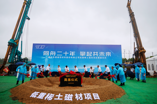 6月28日上午,主題為“同舟二十年,擎起共未來(lái)”的煙臺(tái)東星磁性材料股份有限公司低重稀土磁材項(xiàng)目奠基儀式在福山高疃臨港工業(yè)園舉行。福山區(qū)委書(shū)記李金濤,副區(qū)長(zhǎng)王福穎,福山高新區(qū)管委書(shū)記宮濤,公司董事長(zhǎng)、董事、員工代表等150余人參加了此次儀式。此項(xiàng)目新購(gòu)置土地約5萬(wàn)平方米,總建筑面積4.6萬(wàn)平方米。2023年上半年達(dá)產(chǎn)后,年新增燒結(jié)釹鐵硼永磁材料產(chǎn)能5000噸。