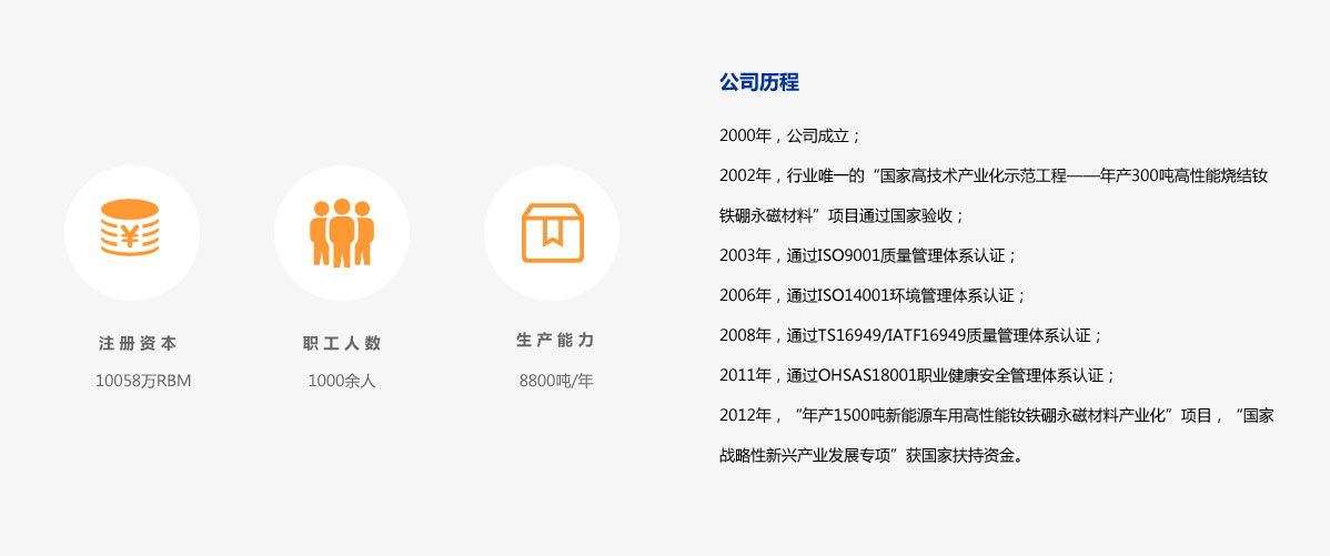 公司項目初期從德國、日本、美國引進了先進的生產、研發及檢測設備,經過長期自主研發,具有了獨特優勢的專業生產裝備設計、制造及創新能力;獨立掌握了滿足各種高性能要求的磁體制造、機械加工、表面處理、器件裝配、檢驗檢測等全過程的核心工藝技術,擁有高性能鐵硼磁燒結永磁材料的新產品、新裝備和新工藝持續創新的綜合能力和相應的自主知識產權。